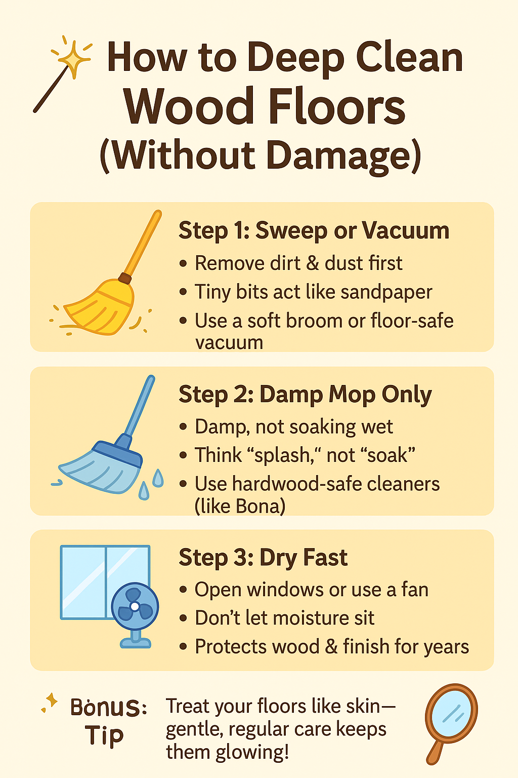 How to deep clean wood floors without damage – 3 easy steps infographic