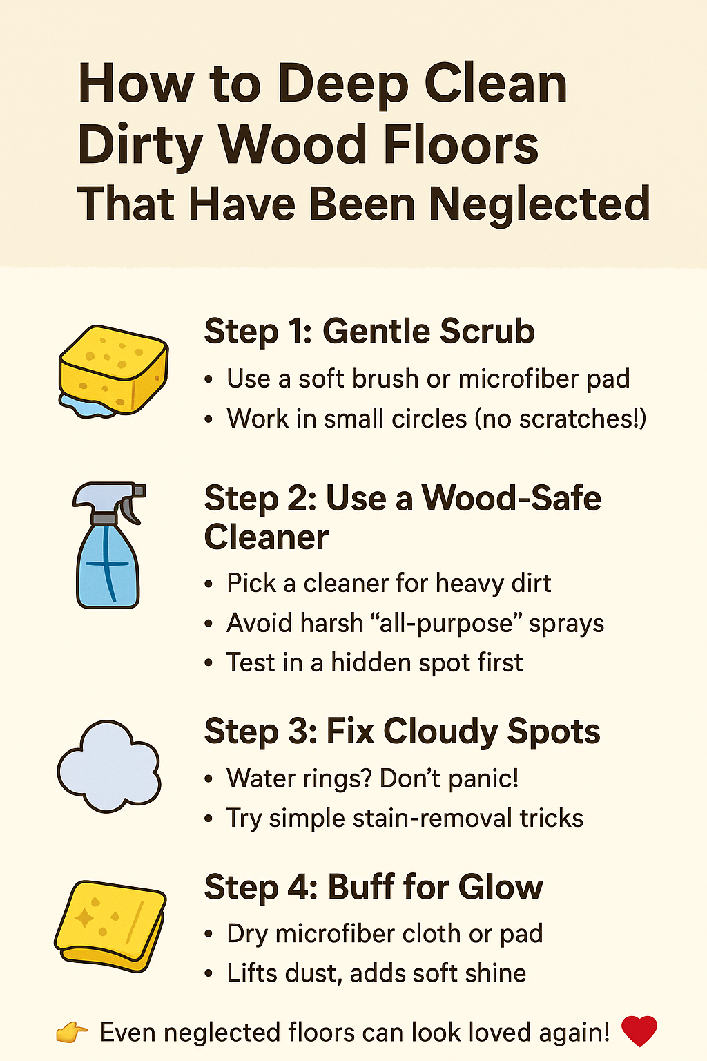 Infographic showing 4 steps to deep clean dirty hardwood floors that have been neglected