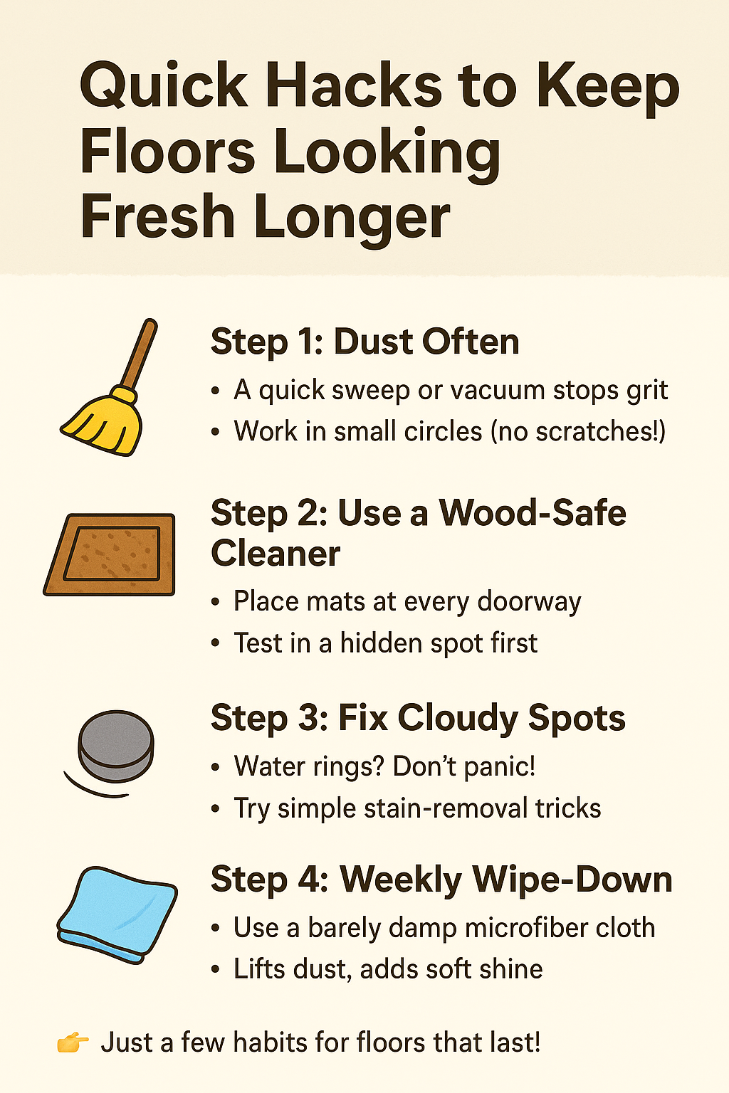 Infographic showing quick hacks to keep wood floors clean and looking fresh longer